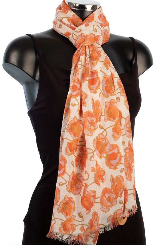 A light and airy scarf featuring vibrant orange floral prints, perfect for spring and summer outfits.